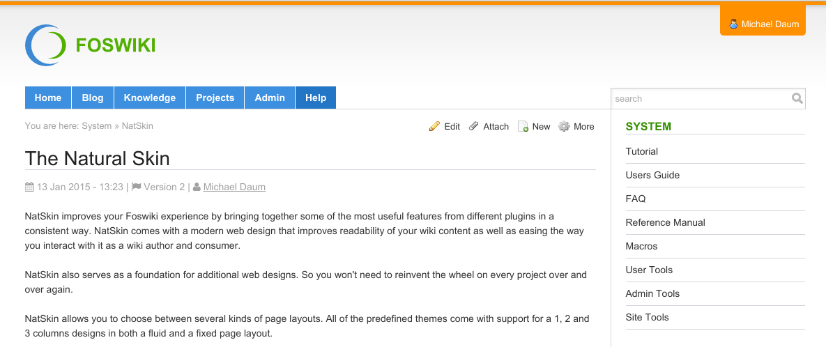 NatSkin improves your Foswiki experience by bringing together some of the most useful features from different plugins in a consistent way. NatSkin comes with a modern web design that improves readability of your wiki content as well as easing the way you interact with it as a wiki author and consumer.